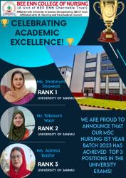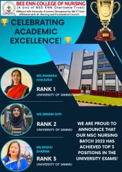 Bee Enn college Of nursing happily announcing the another feather in the crown of Bee Enn Family. Mrs. Janet Anbumani W. Associate Professor cum HOD Obstetrics and Gynaecological Nursing, has received a Award of appreciation from the Medical Employee and Nursing Association, SMGS Hospital, Presented and Honoured by Dr. DARA SINGH, Medical Superintendent, SMGS Hospital, Dr. Sanjeev Digra, Hod pediatrics and the Association president Sr.staff Nurse. Ms. Harpreet mam and members . This was presented during the Independence day celebration,They recognized the outstanding dedication and service of her. This honour is bestowed upon individuals and teams who demonstrate exemplary commitment, and significant contribution to the institutions mission. Congratulations Mrs. Janet Anbumani.