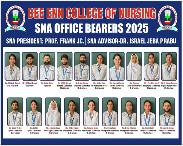 The Student Nurses' Association (SNA) of BEE ENN College of Nursing is one of the best platforms for the student nurses and it provides curricular and co-curricular programs, communicates issues and concerns relevant to nursing, encourages participation in community health-related activities and promotes legislative involvement of the nursing student. The SNA aids in the development of the whole person, his/her professional role and his/her responsibility for healthcare of people in all walks of life. SNA unit of our college strictly follows the Bye- laws of Trained Nurses Association of India (TNAI).